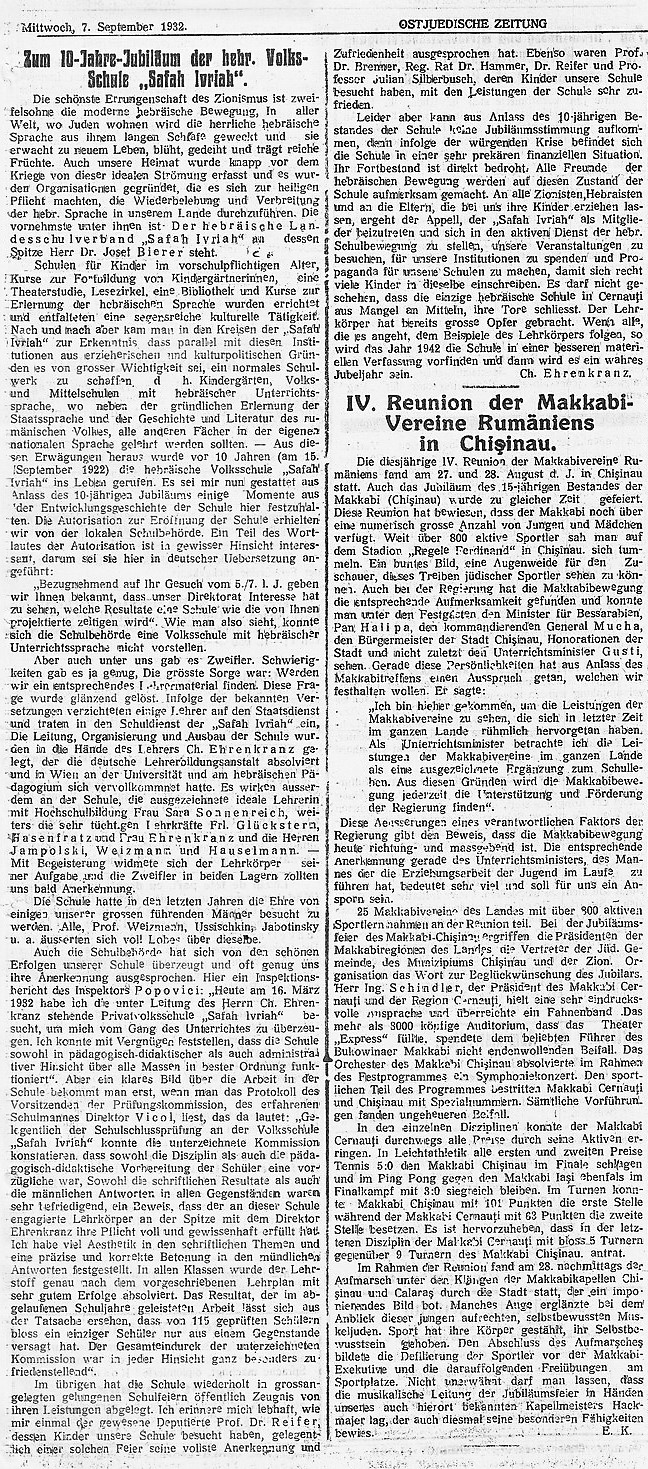 Im September 1922 bewilligte der Generalsekretar für Unterricht, Alecu Procopovici, die Eröffnung einer privaten hebräischen Volksschule durch die „Safah Ivriah“, die auch der junge Schüler Paul Antschel und spätere Lyriker Paul Celan von 1927 bis 1930 besuchte. Bis Anfang der 1930er Jahre befand sich die Schule im Rückgebäude der jüdischen Toynbeehalle und war über den hinteren Eingang in der Färbergasse 5 erreichbar, ehe sie ihren Standort wechselte (heutige Synagogen Str. 6).
