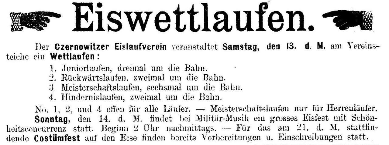 Der Czernowitzer Eislauf-Verein veranstaltete seit 1896 Abendläufe unter elektrischem Licht. Eine Mitgliederkarte konnte man damals für 5 Forint erwerben, einmaliges Laufen kostete an gewöhnlichen Tagen 40 Kreuzer, an den Tagen mit Musikbegleitung 80 Kreuzer. (Czernowitzer Eislaufverein. In: Bukowiner Post. Nr. 466, 29. November 1896, S. 6).