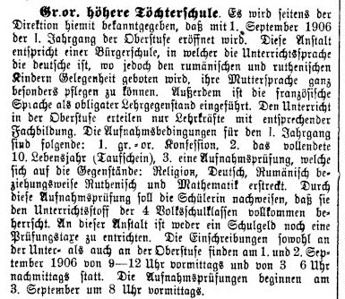 Die Nachfrage nach Schulplätzen und schulischer Bildung wuchs und bereits 1906 eröffnete die höhere Töchterschule die erste Klasse der Oberstufe. Um die Oberstufe besuchen zu können, mussten Bewerberinnen folgende Aufnahmebedingungen erfüllen: „[…]1.) gr.-or. Konfession, 2.) das vollendete 10. Lebensjahr (Taufschein), 3.) eine Aufnahmsprüfung [sic] welche sich auf die Gegenstände Religion, Deutsch, Rumänisch bzw. Ruthenisch und Mathematik erstreckt. Durch diese Aufnahmsprüfung soll die Schülerin nachweisen, daß sie den Unterrichtsstoff der 4 Volksschulklassen vollkommen beherrscht“ ([Neue] Freie Lehrer-Zeitung, 6. August 1906, S. 6-7).